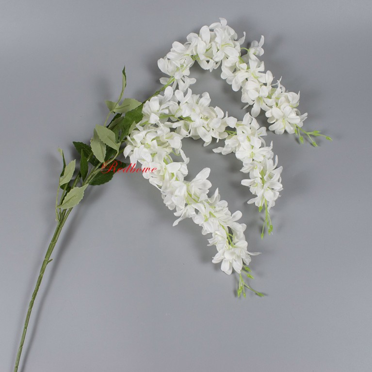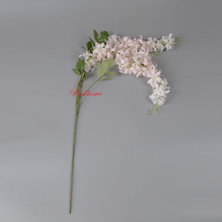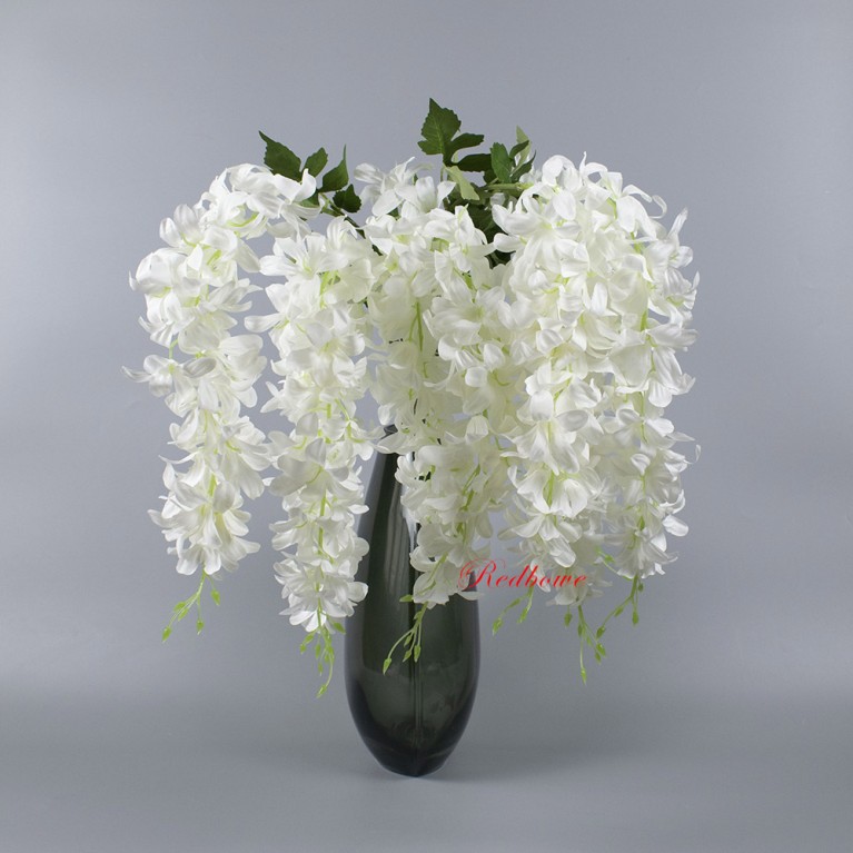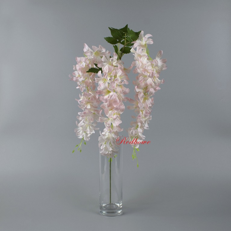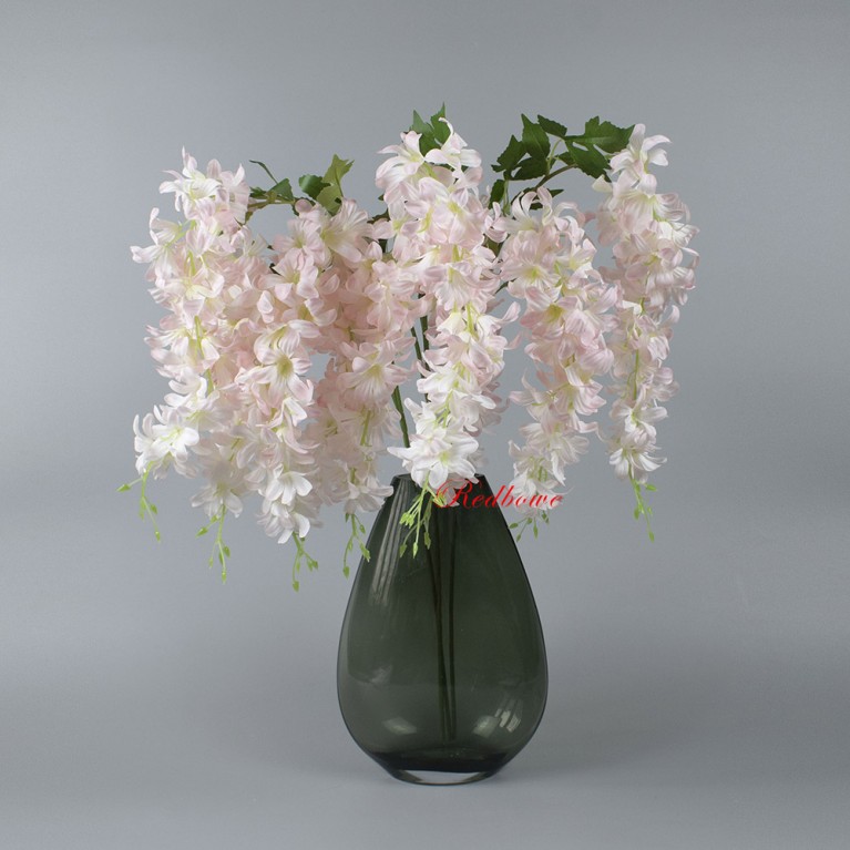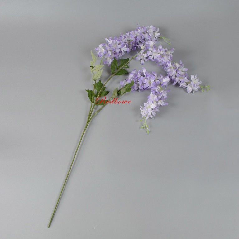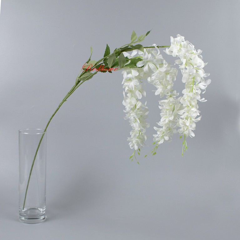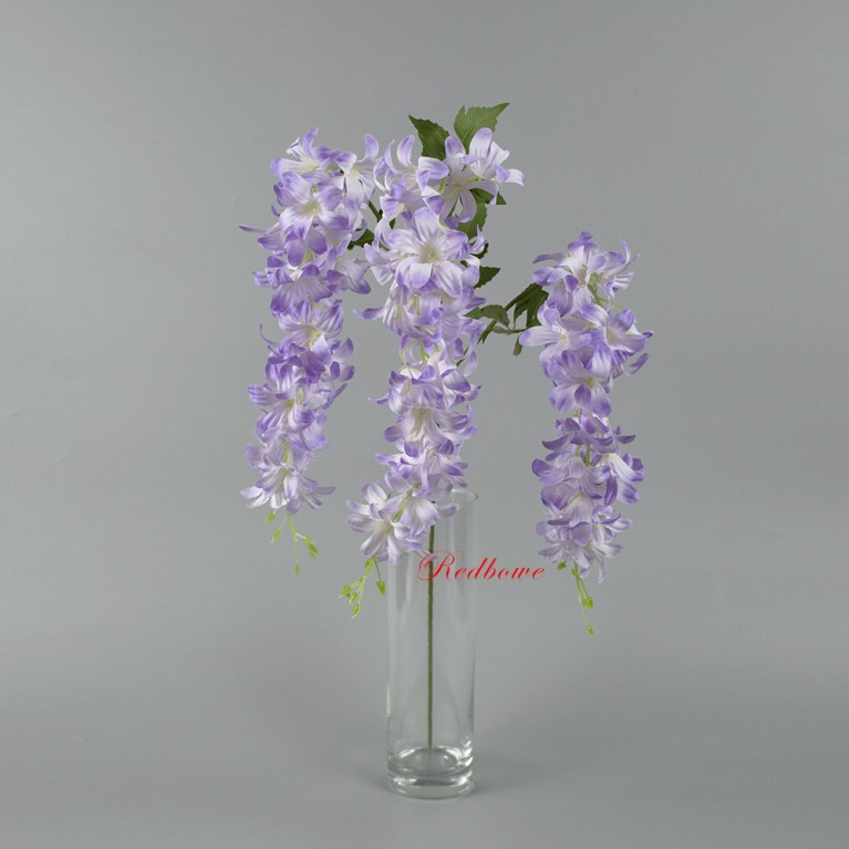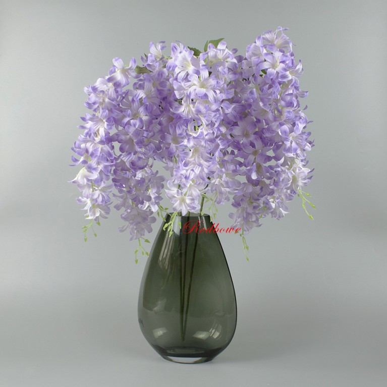 Искусственная глициния высочайшего качества. Гибкие стебли позволяют придавать ветке любую форму, а многослойные соцветия выглядят максимально естественно. Ветка глицинии подходит для составления букетов, декорирования лестничных пролетов и потолочных конструкций.